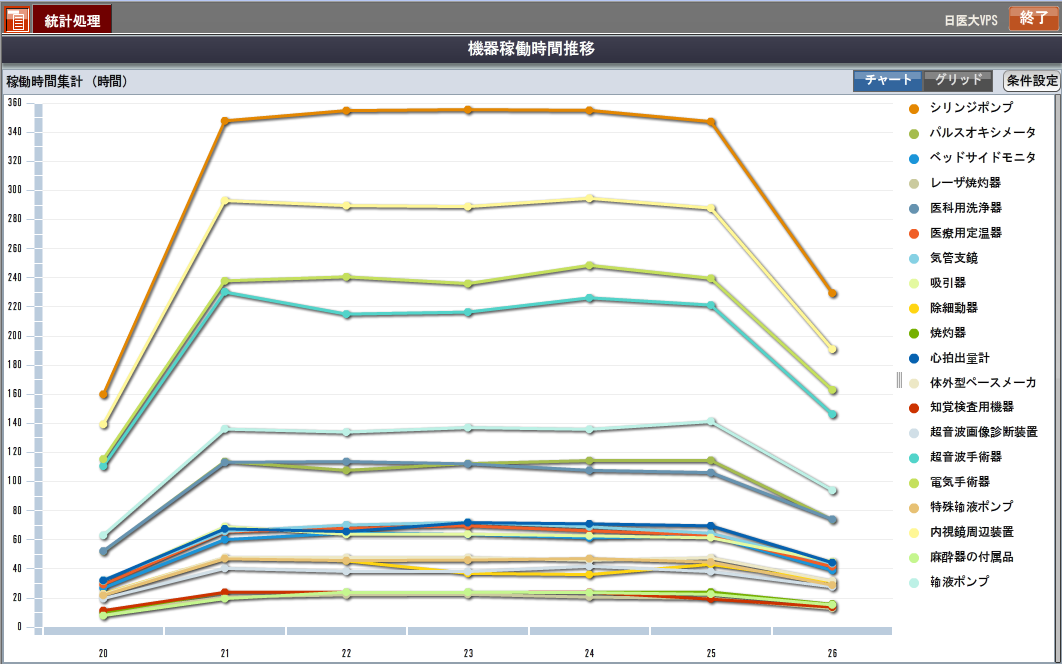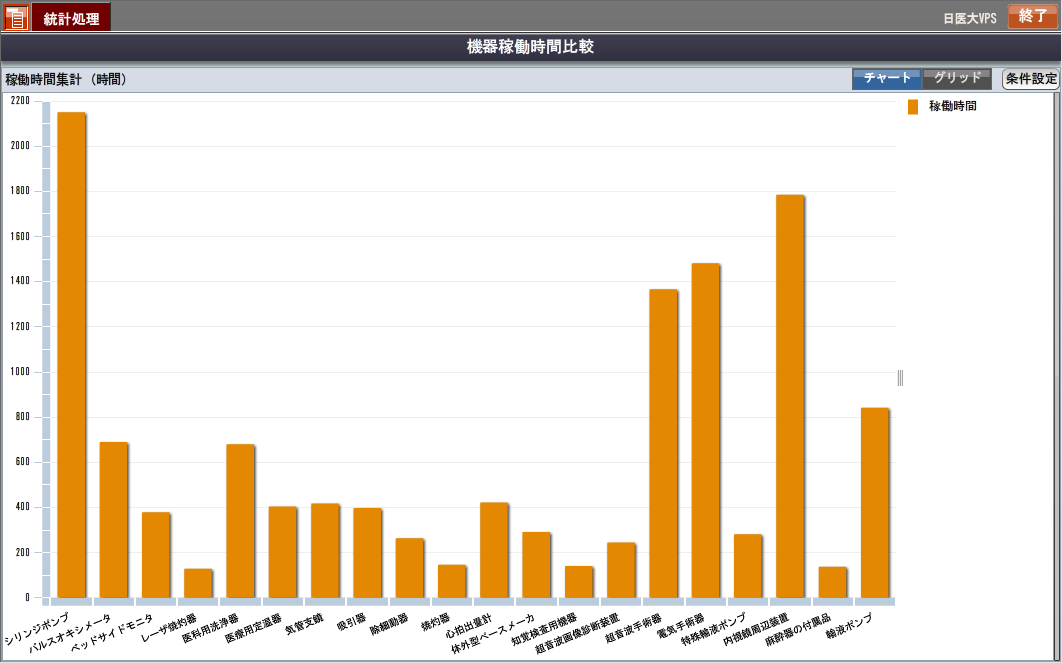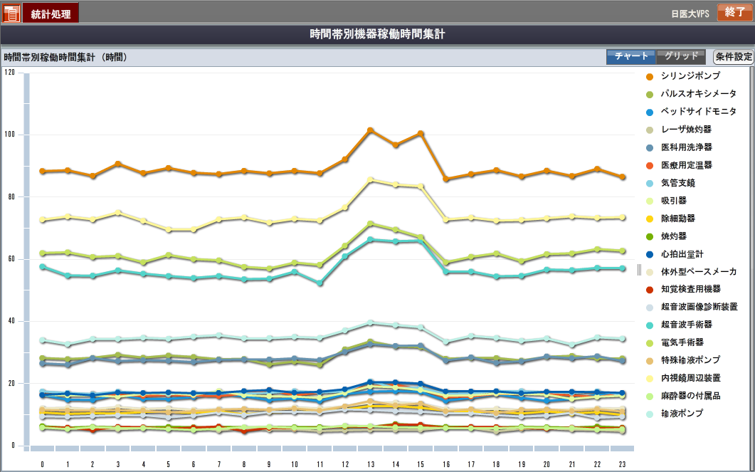 一日、週、月、年間の機器個々の稼働状況、部署別の所在状況、無検知状況、ボタン押下回数(オプションで機器のアラーム回数)などの統計処理を実現します。