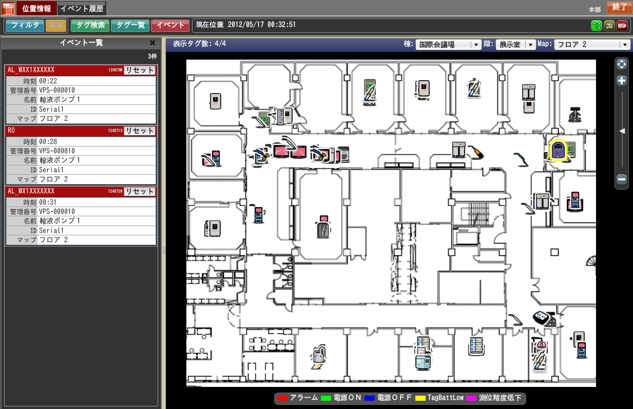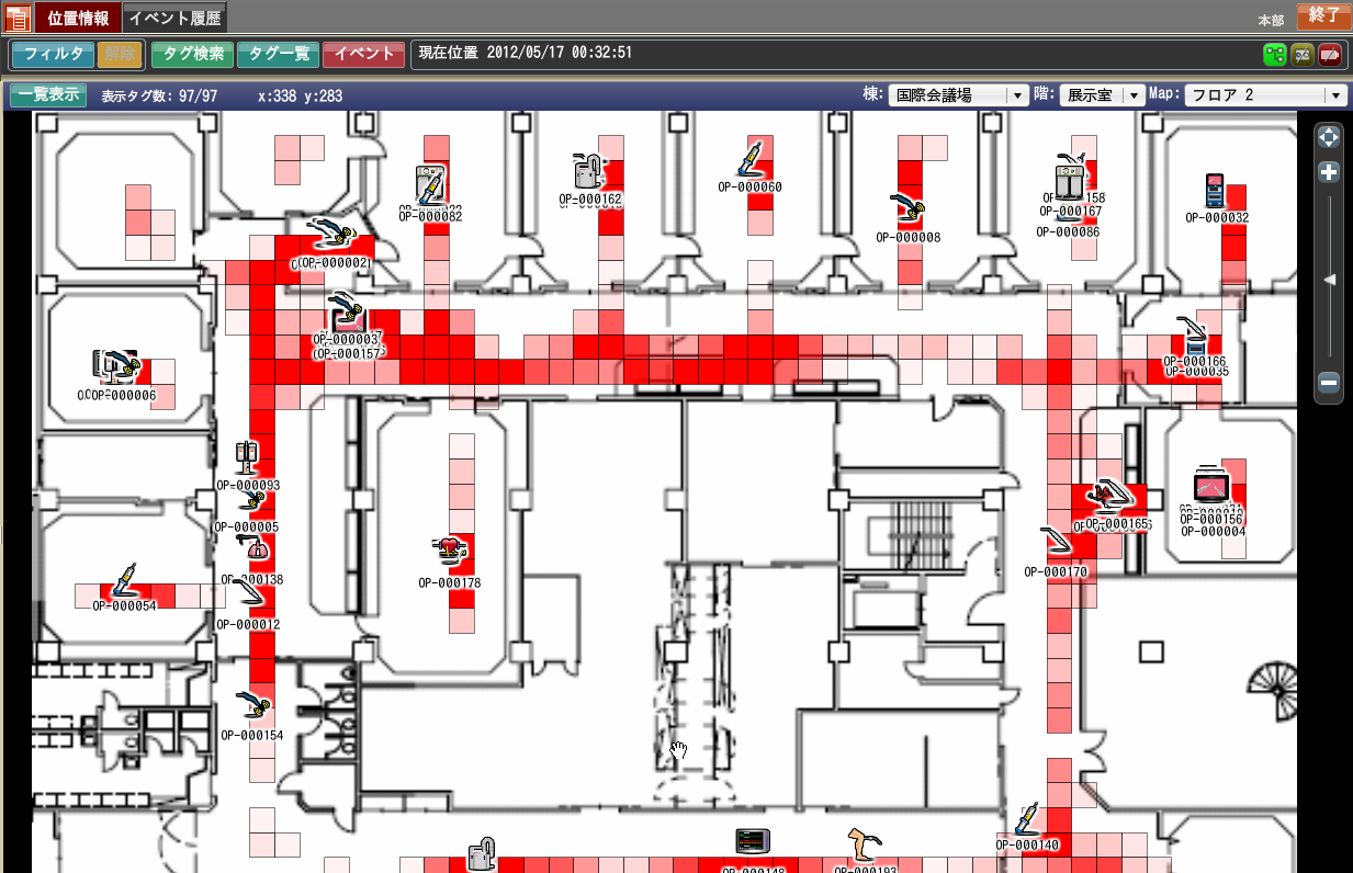 Open Library VPS (Visual Positioning System )は無線タグのリアルタイム位置・状態情報を利用して、人や機器の位置や状態を監視するとともに、その位置・状態の履歴を管理し、稼働状況や場所別の所在率などの統計処理および、移動のトレース機能による導線管理を実現するシステムです。貸し借りといった旧来の管理を不要とし、機器の現在状態を監視するとともに、その位置・状態の履歴を管理し、機器の稼働や部署別の機器所在率などの統計処理を実現します。