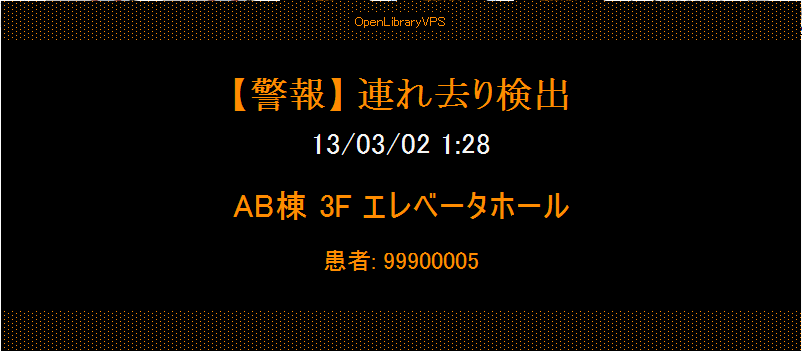 Open Library VPS (Visual Positioning System )は無線タグのリアルタイム位置・状態情報を利用して、徘徊患者の無断離院や新生児の連れ去りを監視します。患者の位置はリアルタイムで捕捉され、徘徊患者の場合は居住エリア内は自由に行動できるものの、居住エリアからの失踪を確認すると直ちにアラームを出します。新生児監視の場合は、親子のペアおよび職員と新生児のペア以外での単独検出を監視し、新生児単独で危険エリアに存在すれば即危険とみなしアラームすることができます。ひとたびアラーム状態が発生したら、継続してその患者は危険な状態として監視下におかれ位置の変化を追跡します、一階など他のフロアに出現するとその場所をアラームとして通知し、職員によるいち早い捕捉・安全確保を可能にします。
