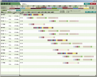 設計されたコースは実施段階の処理の乱れによりそれが絵に描いた餅に終わらないように進捗の軌道修正をおこないなが ら消化されていく必要があります。その ためには、協業するスタッフが現在状況を的確につかみ各自の役割を正確にこなしていくための羅針盤が必要です。人間ドック検診システム 「OpenLibraryXam」では視覚化された進捗管理画面により、予定と実際の誤差をつかみ、後続する検査担当がうまく乱れをコントロールするため の情報を提供します。